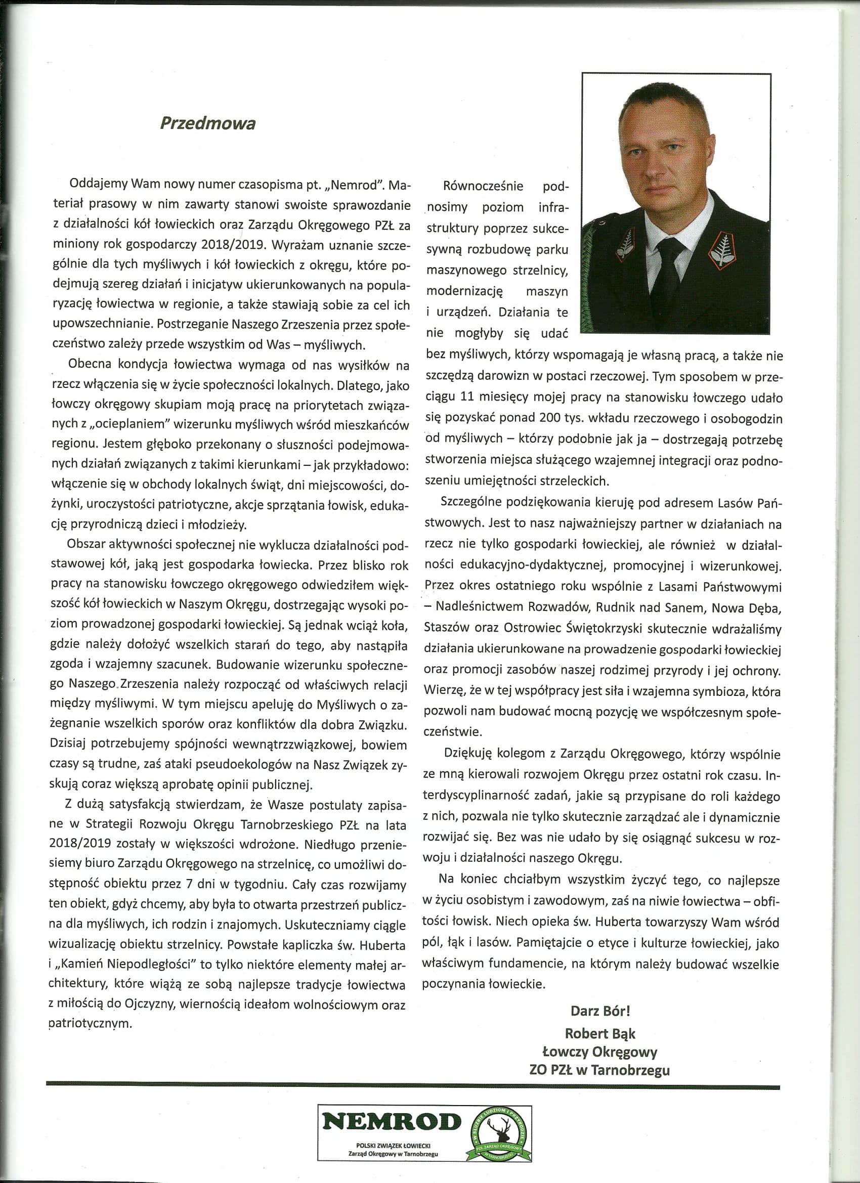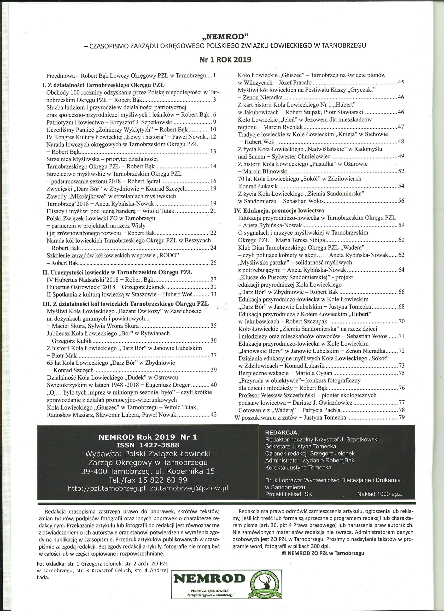 Koleżanki i Koledzy myśliwi, przyszli adepci i sympatycy łowiectwa – zapraszamy do nabywania naszego Okręgowego rocznika „Nemroda”. Jest to nowa odsłona prezentująca dorobek pracy nie tylko Zarządu Okręgowego ale przede wszystkim kół łowieckich zrzeszonych w Okręgu PZŁ Tarnobrzeg. Rocznik jest wydany w pełnym kolorze, ubogacony licznymi fotografiami i podzielony jest na obszary tematyczne związane z przekrojową działalnością myśliwych, kół łowieckich i Zarządu Okręgowego oraz innych podmiotów społecznych działających w ramach Zrzeszenia – Klubu Dian Wadera czy też Zespołu Sygnalistów „Raróg”. Objętość Nemroda liczy 84 strony.