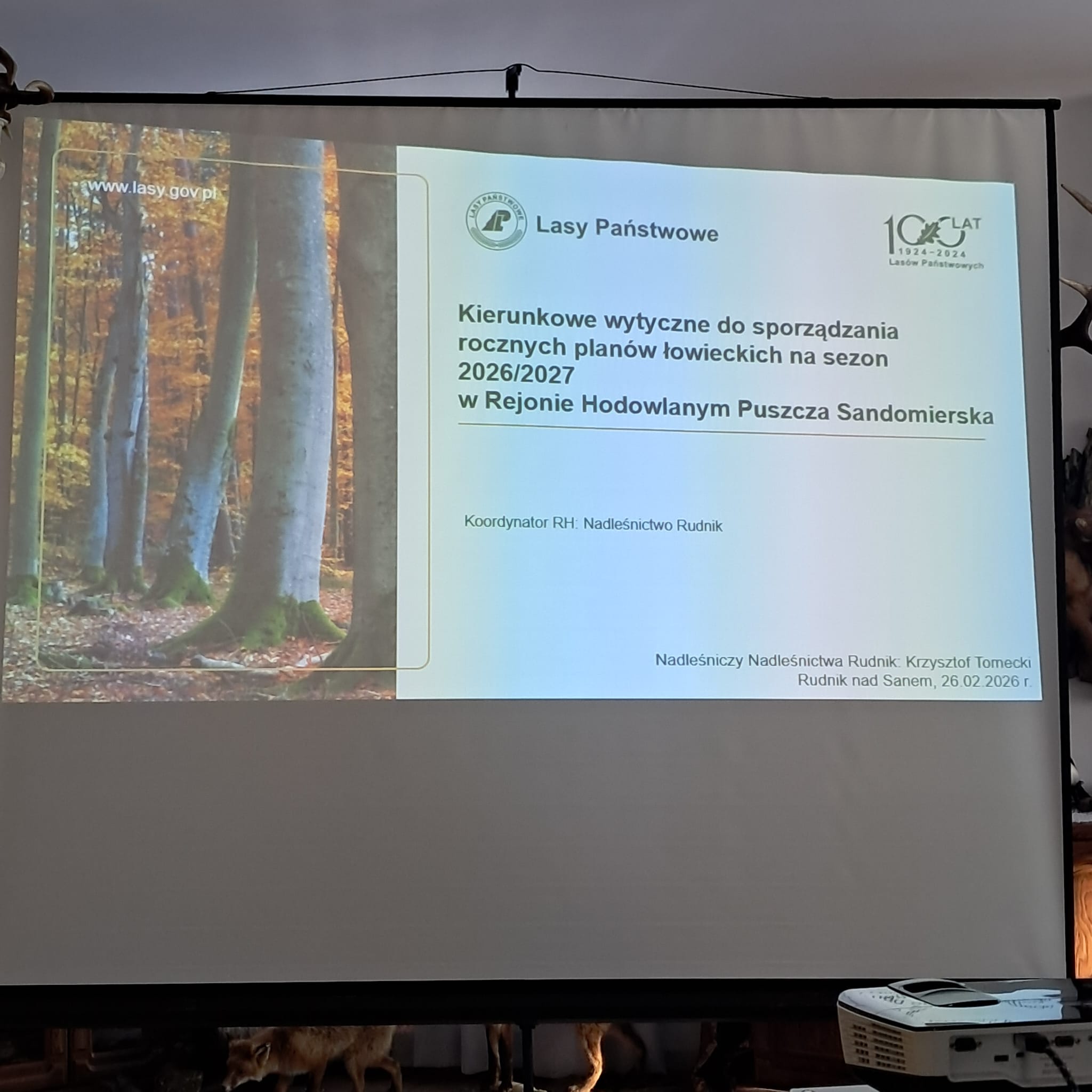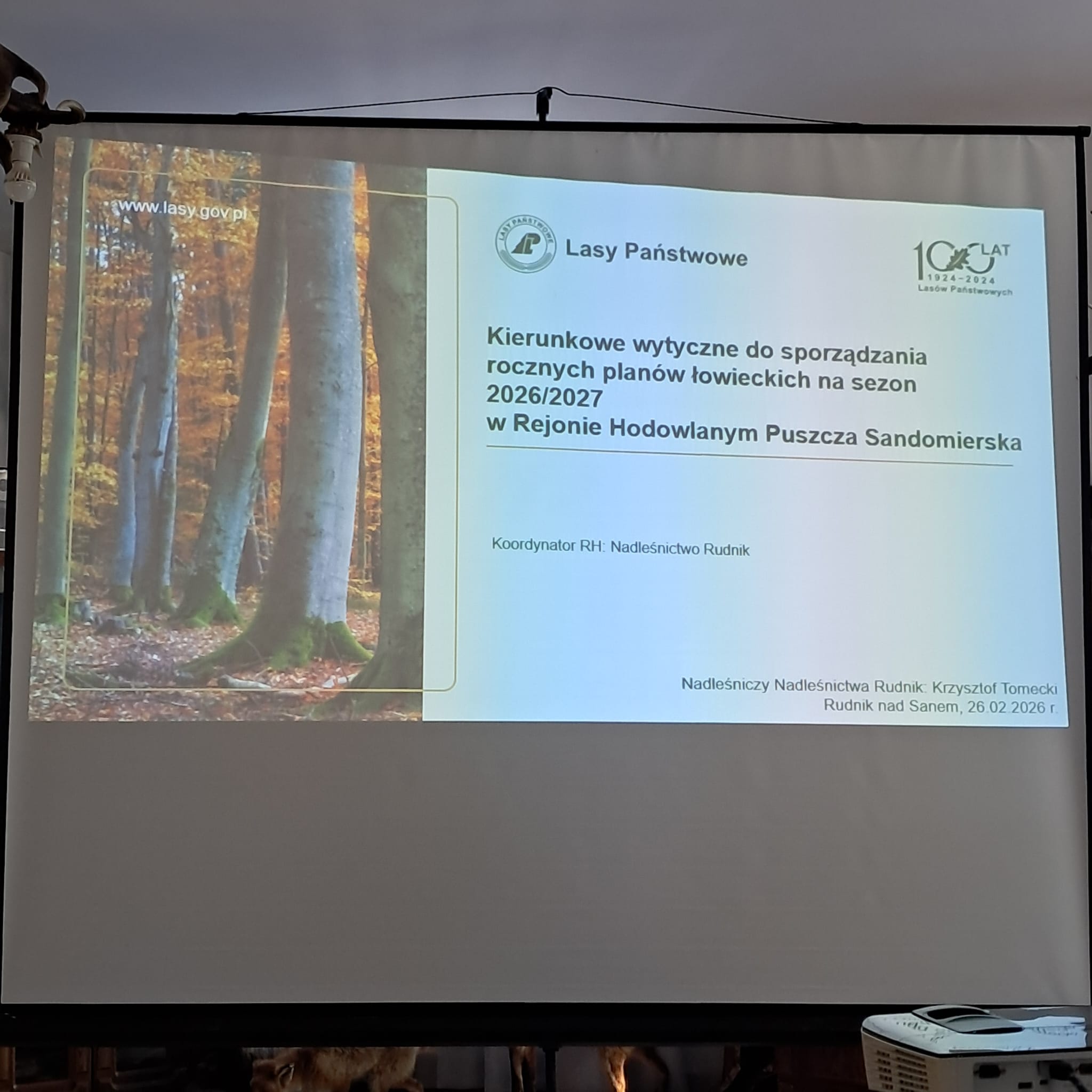 W dniu 26 lutego 2026 r. odbyło się spotkanie w Nadleśnictwie Rudnik nad Sanem, na którym omówiono wytyczne do sporządzenia rocznych planów łowieckich na sezon gospodarczy 2026/2027 przy uwzględnieniu osiągnięcia zagęszczeń docelowych przewidzianych w wieloletnich łowieckich planach hodowlanych, poziomu szkód wyrządzanych przez zwierzynę i ponoszonych kosztów ochrony lasu.